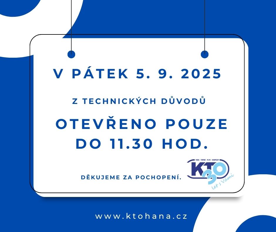 Upozorňujeme naše zákazníky, že v pátek 5.9.2025 bude z technických důvodů otevřeno pouze do 11.30 hod.