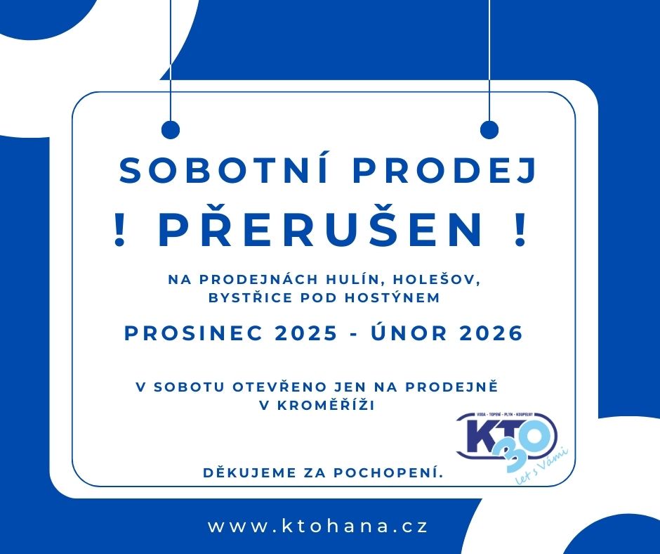 Upozorňujeme naše zákazníky, že od prosince 2025 přerušujeme sobotní prodej na našich pobočkách v Hulíně, Holešově a Bystřici pod Hostýnem. Sobotní prodej bude zahájen opět od března roku 2026.
