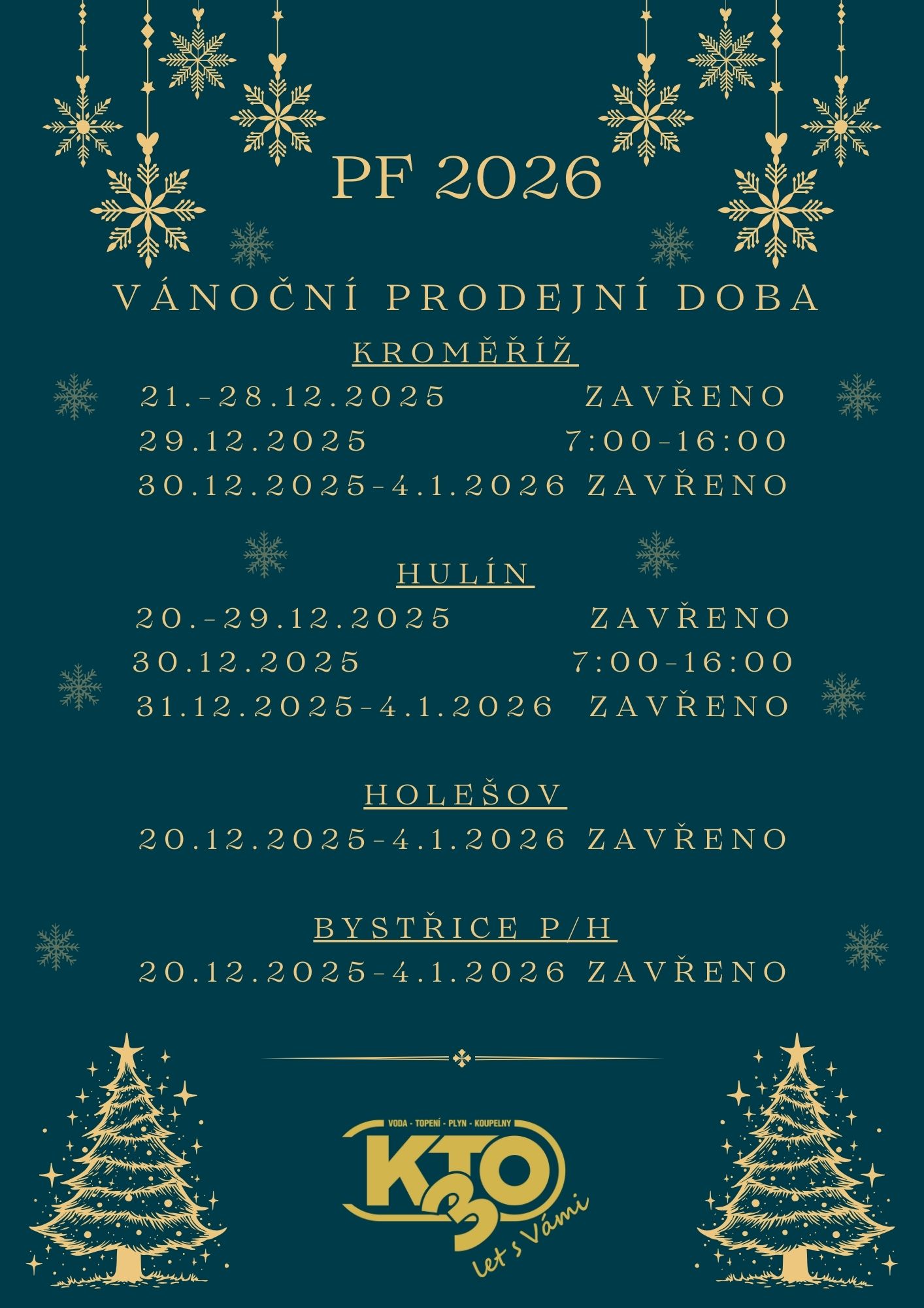 Rádi bychom informovali naše zákazníky, že od 23. 12. 2025 do 4. 1. 2026 budeme mít zavřeno na všech prodejnách. S výjimkou 29. 12. 2025, kdy bude otevřeno na prodejně v Kroměříži 7-16 hod a 30. 12. 2025 v Hulíně 7-16 hod.